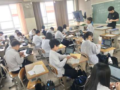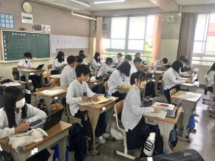 生徒は、和歌山県串本町で取り組まれているマグロの養殖を紹介する動画を見て、その技術だけでなく、技術者が養殖にかける思いについても考えています。