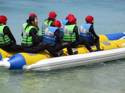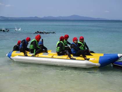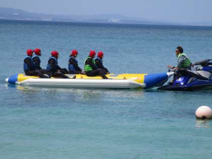 2日目、4日(火)午前、きれいな、透きとおった海でのバナナボートの体験の様子です。