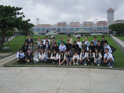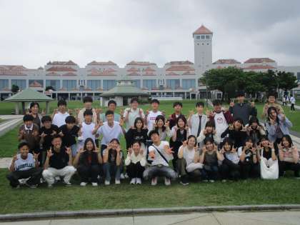 1日目、平和祈念資料館をバックにクラス写真撮影です。