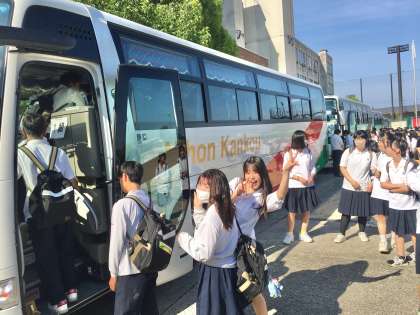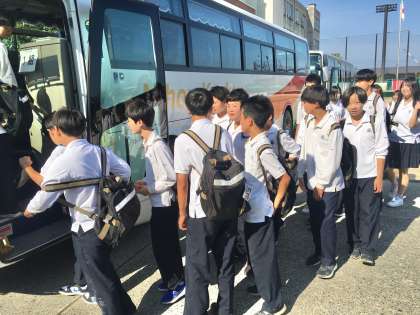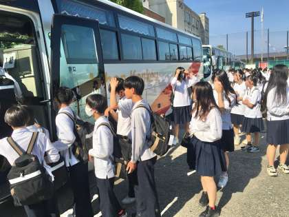 7:50 バス乗車 1組生徒の様子です。校外学習に向けたワクワク感が高まります!