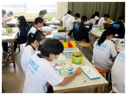 1年生:美術の授業〜3原色!〜 公開日 2024/09/12 更新日 2024/09/12 学校 1年生は、美術の授業で、「色」について学習しています。 マゼンタ、シアン、イエローの3原色を用いて、12色の色相環づくりにチャレンジしています。 ※写真は、4組の授業の様子です。