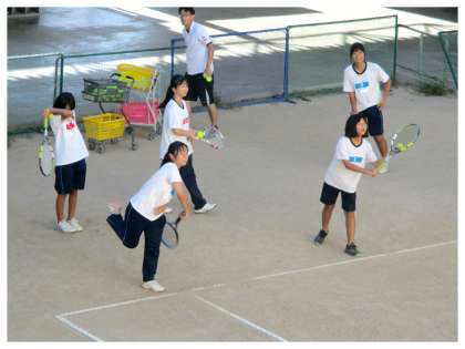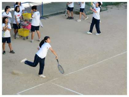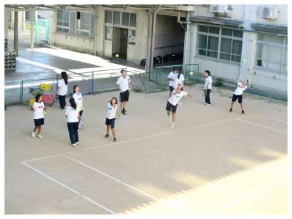 18日(水)、中庭テニスコートでのサーブ練習の様子です。