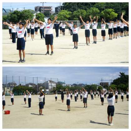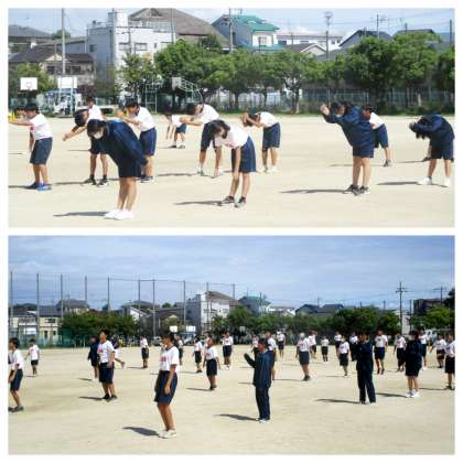 1年生5・6組の授業(保健体育)の様子 公開日 2024/09/24 更新日 2024/09/24 学校 24日(火)、1年生5・6組の3時間目は、保健体育の授業でした。 授業では、学年種目「ローハイド」の練習を行いました。ローハイドは、4人1組で騎馬を作って、的となるコーンまで走り、騎手役の生徒がボールをくくりつけたロープを振りまわしてそのコーンを倒すリレー形式の種目です。