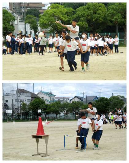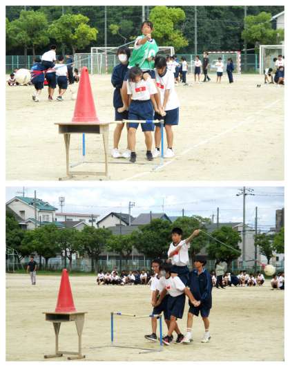 1年生:学年種目プレマッチ 〜体育大会に向けて〜 公開日 2024/10/09 更新日 2024/10/09 学校 9日(水)、1年生は、体育大会に向けた学年練習の中で、学年種目のプレマッチを行いました。 学年種目は「ローハイド」で、4人1組で騎馬を作って、的となるコーンまで走り、騎手役の生徒がボールをくくりつけたロープを振りまわしてそのコーンを倒すリレー形式の競技です。