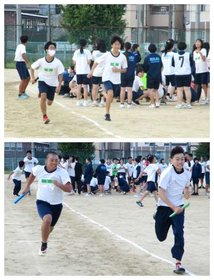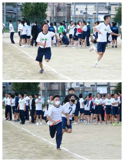 9日(水)、3年生は、6時間目にグラウンドで体育大会に向けて学年種目「one for all relay(学級対抗全員リレー)」のプレマッチを行いました。