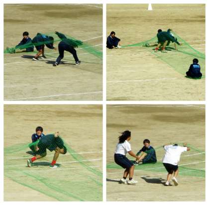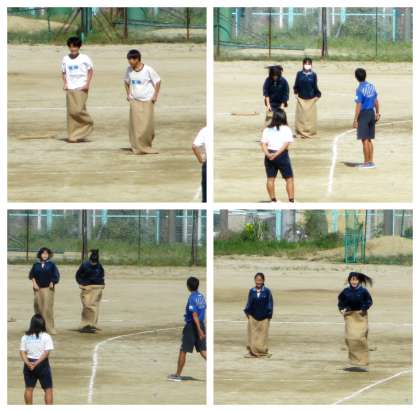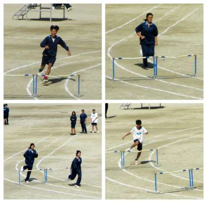 バラエティ・リレー 〜第40回体育大会〜 公開日 2024/10/14 更新日 2024/10/11 学校 プログラム・ナンバー9は、バラエティ・リレーです。 第1・3・5走者は、2台のハードルを飛越して、あみをくぐります。第2・4・6走者は、大きなマットを越えた後、あさ袋に入った状態でジャンプをしながら最終のゴールをめざします。