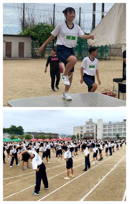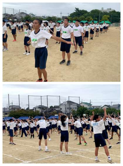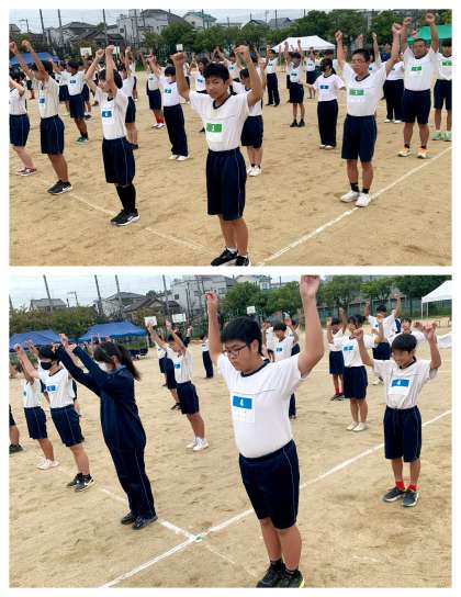 16日(水)、体育大会の予行を行いました。写真は、開会式後の準備体操の様子です。