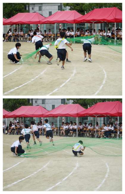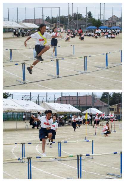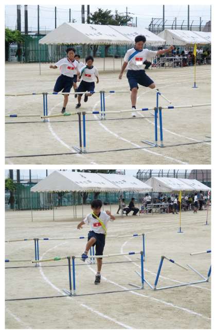 第1・3・5走者は、2台のハードルを飛越して、あみをくぐります。第2・4・6走者は、大きなマットを越えた後、あさ袋に入った状態でジャンプをしながら最終のゴールをめざします。