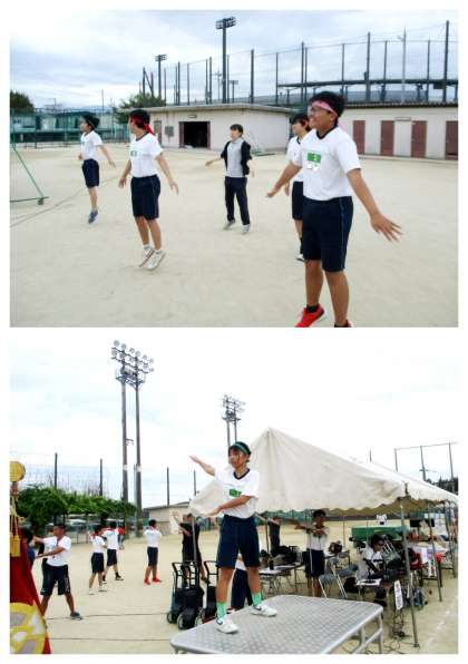 準備体操 〜第40回体育大会〜 公開日 2024/10/19 更新日 2024/10/19 学校 開会式のしめくくりは、参加生徒全員による準備体操です。朝礼台での模範演技は、3年生の代表生徒が務めてくれました。