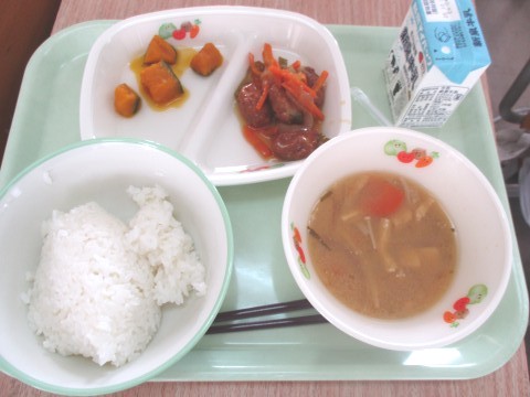 16日(木)、給食の献立は、肉団子の甘酢あんかけ・かぼちゃのうま煮・ご飯・みそ汁・牛乳です。