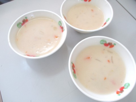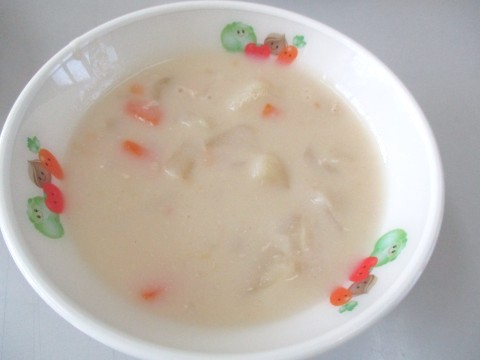 鶏肉と牛乳をベースに、粉末チーズでコクを加え、にんじん・クリームコーン・たまねぎ・じゃがいもがたっぷり入った体にうれしいシチューでした。