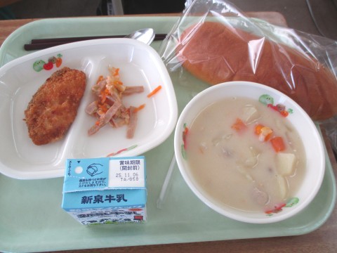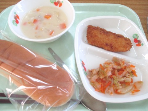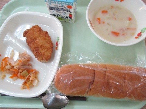23日(木)、給食の献立は、コッペパン・クリームシチュー・イタリアンサラダ・サーモンフライ・牛乳です。