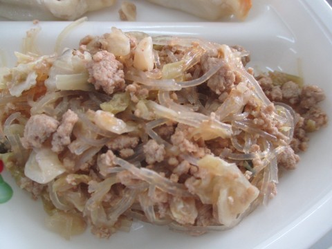 春雨と豚挽肉、キャベツ、青ねぎを豆板醤とごま油で炒めた一品でした。