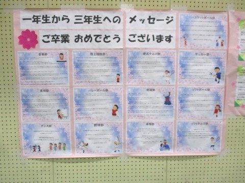 1年生が、卒業する3年生へ心を込めて掲示物を作りました掲示物には、1年生一人ひとりが先輩への思いを言葉にしたメッセージが並んでいます。
