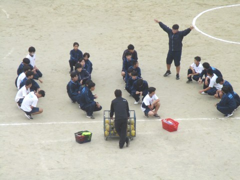 男子生徒は、グラウンドでハンドボールについて学習していました。