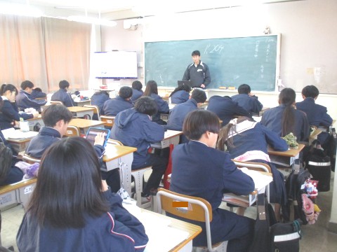 生徒は、自身の意見や思いについて書く課題に取り組んでいました。