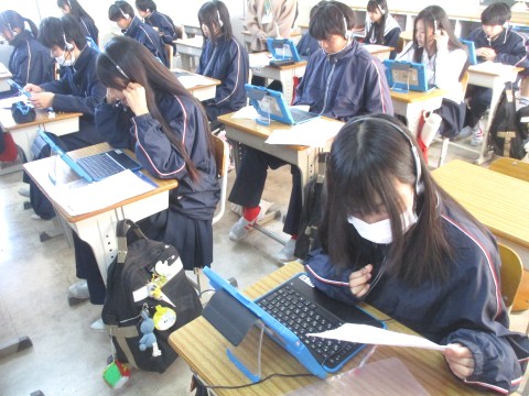 生徒は、自身の意見や思いについて書く課題に取り組んでいました。