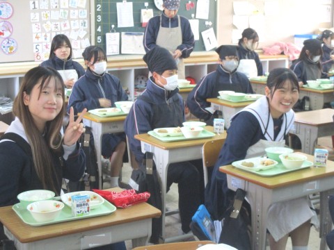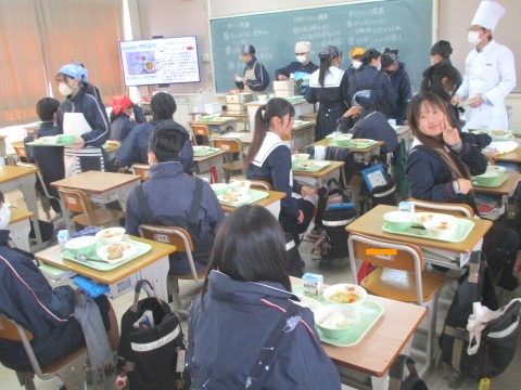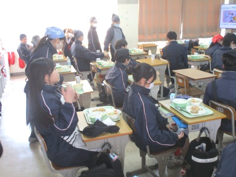2年生1組の喫食の様子です。汁物は、ポトフでした。スープには、にんじんやたまねぎなどの野菜の甘みが染み込んでいました。また、こしょうの香りが食欲を増進させるアクセントとなり、おわんの中が空っぽになる生徒が多くいました。+1