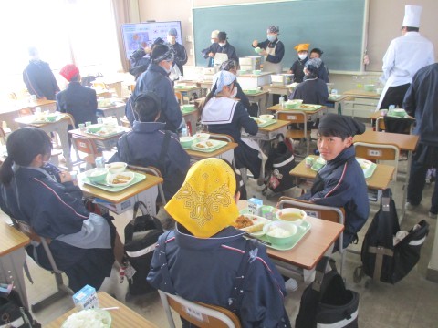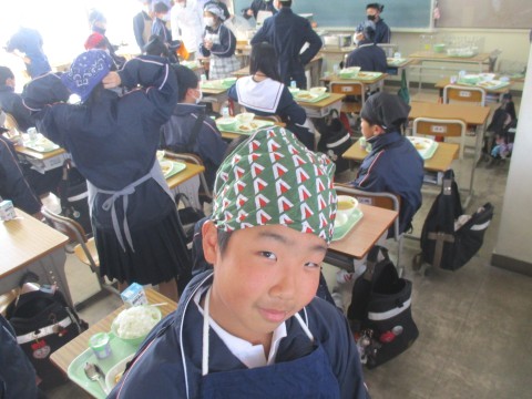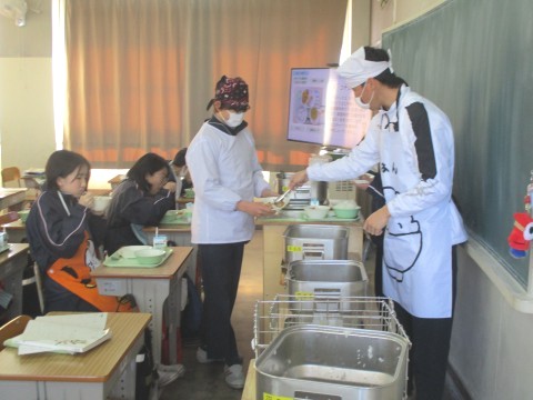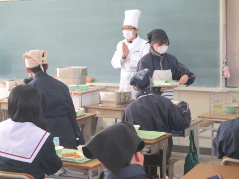 4日(水)2年生3組の配膳の様子 ~幸せのスープ!~
