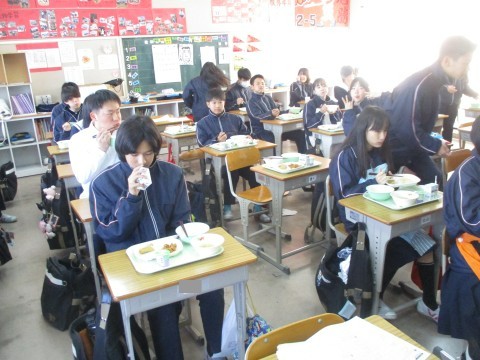 2年生1組の喫食の様子です。汁物は、ポトフでした。スープには、にんじんやたまねぎなどの野菜の甘みが染み込んでいました。また、こしょうの香りが食欲を増進させるアクセントとなり、おわんの中が空っぽになる生徒が多くいました。+1