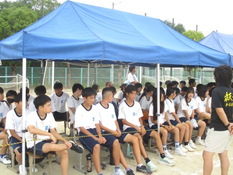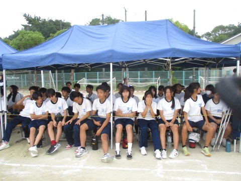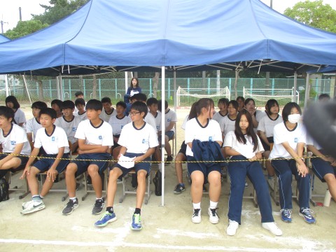 24日(水)、体育大会の予行を行いました。写真は、3年生応援席の様子です。