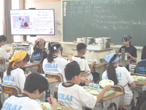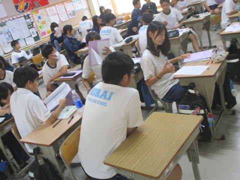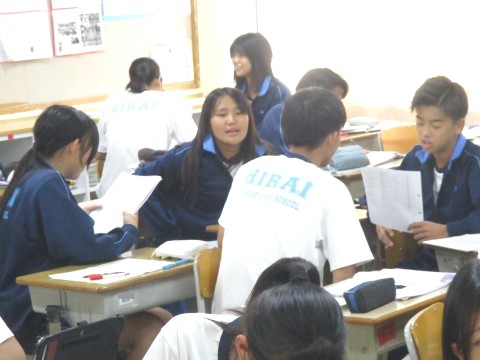英語で自分の考えを伝えたり、相手の意見を尋ねたりする言語活動が行われていました。