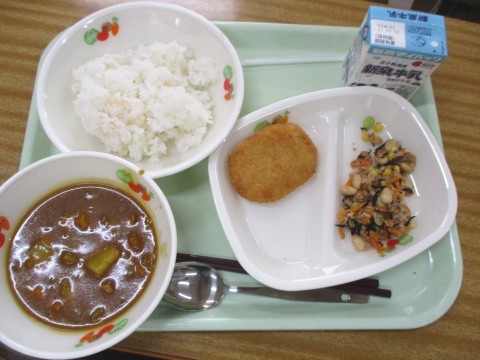 3日(金)、献立は、スパイシーな香りが魅力なポークカレー、サクサク食感のコロッケ、体にうれしいひじきサラダでした。献立を考える方の工夫や思いがこもった内容でした。