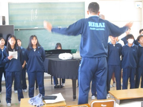 生徒は、学年コーラスコンクールのクラス曲「story」の練習に取り組んでいました。