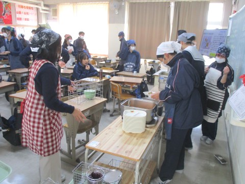 5日(木)3年生5組の配膳の様子 ~ピリ辛メニュー!~