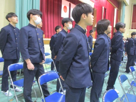 写真は、国歌および校歌の斉唱の様子です。