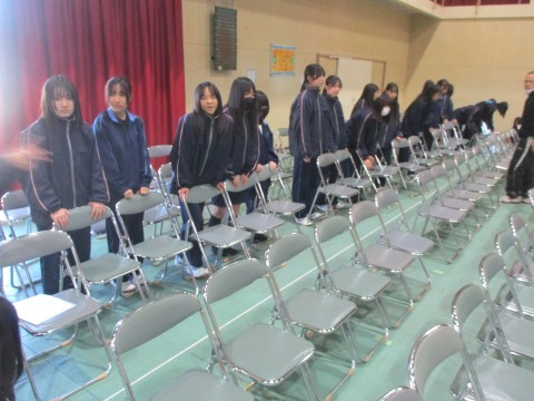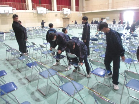 11日(水)、放課後、剣道部や男子バスケットボール部の生徒が中心となり、12日(木)2時間目に実施される卒業式予行の会場準備をしてくれました。