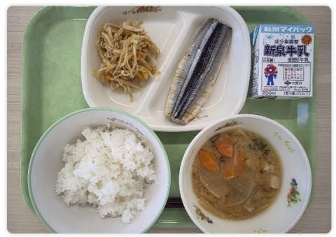 10月1日(水)の給食の献立は、焼きさんま、切干大根の煮物、さつま汁です。