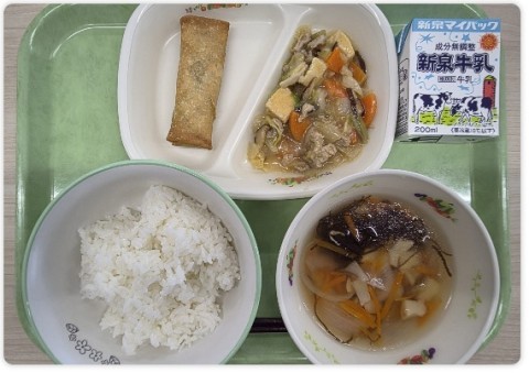 31日(金)、献立は、ごはん、牛乳、厚揚げとキャベツのみそ炒め、春巻、もずくスープです。