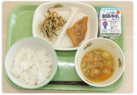 30日(金)、献立は、ご飯、牛乳、鮭の塩こうじ焼き、高野豆腐のふくめ煮、すいとん汁です。