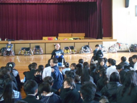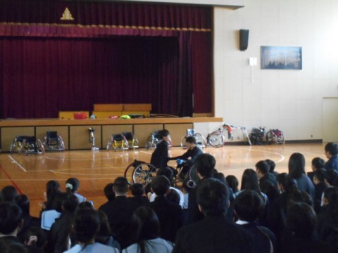 1年生は1・2時間目に体育館にて「NPO法人パラキャン」によるパラリンピックキャラバンを実施しています。