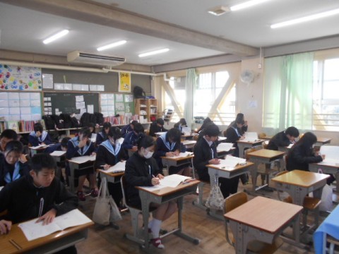 本日、2年生はチャレンジテストに取り組んでいます。教科は5教科(国・社・数・理・英)です。