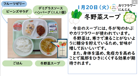 毎年1月24日から30日までの期間は,学校給食週間と定められており,学校給食の意義や役割について理解と関心を深める週間となっています。