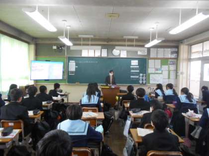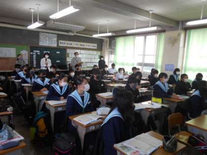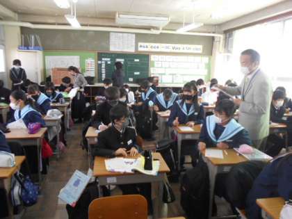 1年4組の3限目の授業は英語でした。今日の授業は初任者研修を兼ねていて、教育センターから専門指導員と指導主事も授業を参観しました。今日の授業のめあては「できることを尋ねたり,その質問に答える」でした。授業では先生の質問や子どもたちの答えなどほとんどが英語で行われました。子どもたちは質問もしっかり聞き取り、ペア活動などもスムーズに行っていました。