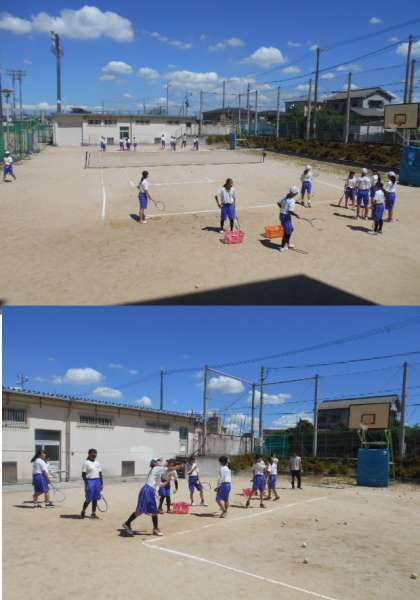 男女ソフトテニス部の練習の様子です。今日も天気が良く気温が高くなっていますが、子どもたちはがんばって練習に取り組んでいます。