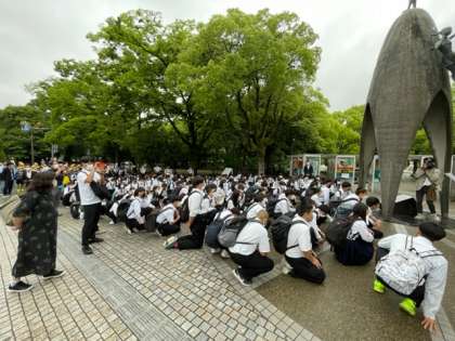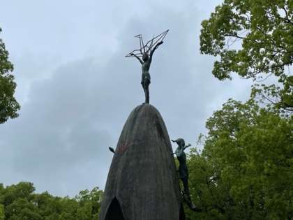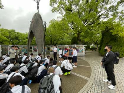 原爆の子の像の前で、平和セレモニーを行いました。子どもたちの表情は真剣です。