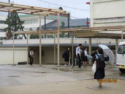 昨晩、大雨になった場合の対応をアップしましたが、今朝は、大雨とならず助かりました。2年生は代休で登校してきませんが、登校してきている1・3年生は元気なあいさつを返してくれました。