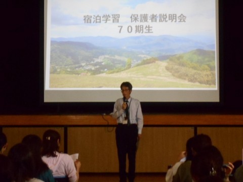 校長先生から挨拶をしたあと、担当者より日時や目的等の行程、持ち物やルールの説明をしました。学年主任からは提出いただく参加確認書やアレルギー確認書の説明をしました。