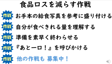 あらかじめ自分に合う量を選んで給食を受け取るか,増やしや減らしをするか,おかわりをして,自分に合った量の給食を食べるなど,いろいろな作戦を考え実行することで食品ロスを減らしていけるようにチャレンジしましょう!