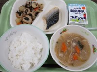 献立はごはん・牛乳・さばの塩焼き・じゃがいものいそ煮・五目汁です。