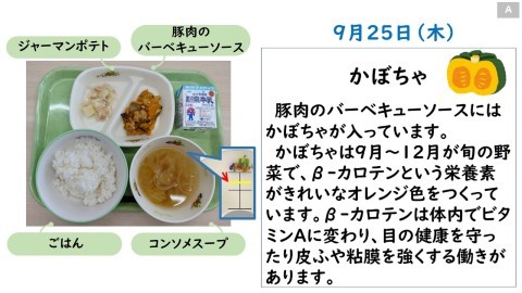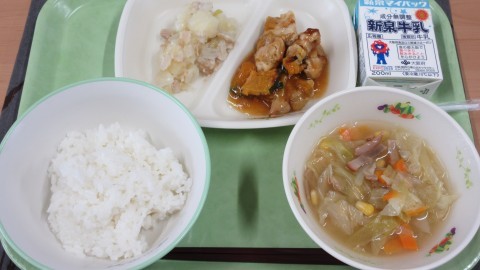 本日月25日(木)はごはん・牛乳・豚肉のバーベキューソース・ジャーマンポテト・コンソメスープです。