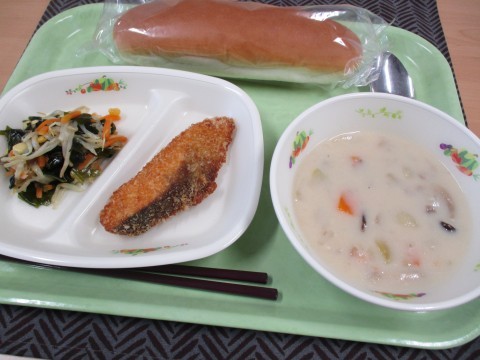 本日11月6日(木)は、コッペパン・牛乳・きのこシチュー・ますフライ・わかめのサラダです。