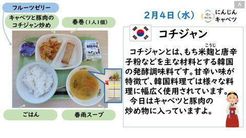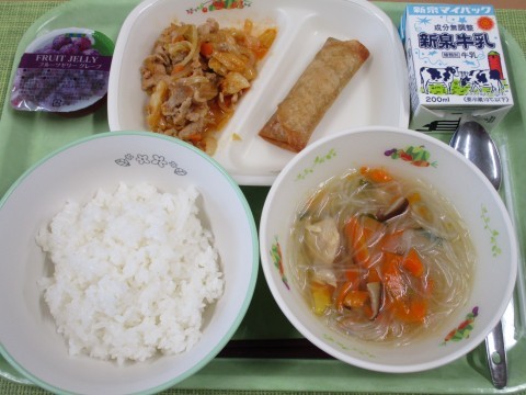 本日2月4日(水)は、ご飯・牛乳・春巻・キャベツと豚肉のコチジャン炒め・春雨スープ・フルーツゼリーです。