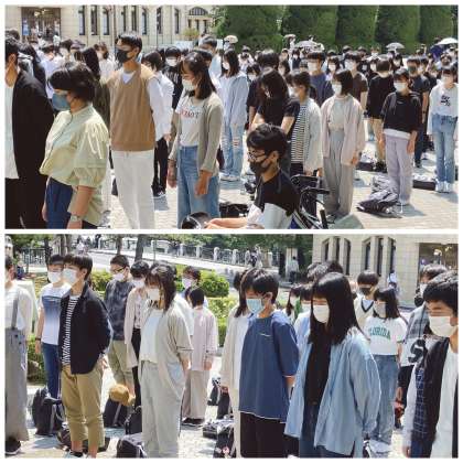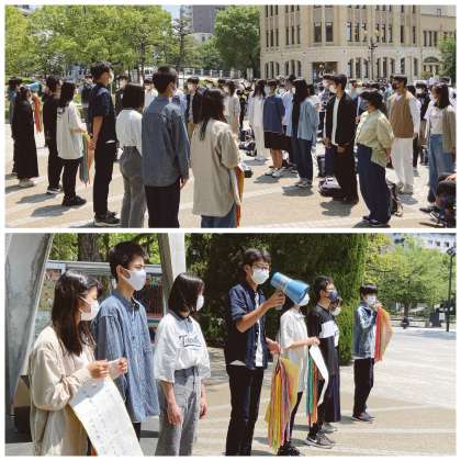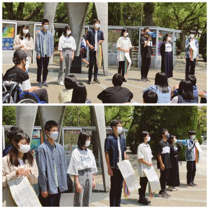 平和宣言,黙とう,祈り鶴献納です。この後はクラス写真撮影をしてから資料館見学です。