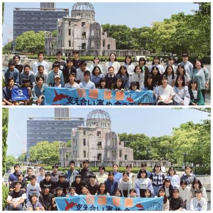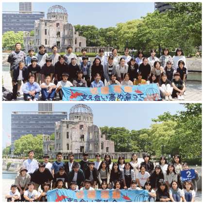 原爆ドームをバックにクラス写真を撮影しました。撮影後は資料館に向かいます。