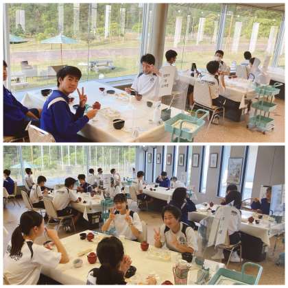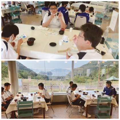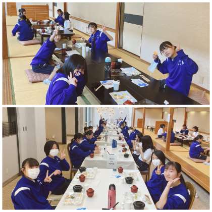 一階の朝食会場です。みんな食が細いですね、、おかわりする生徒はチラホラです・・・。とりわけ運動部員たちは朝からカチ盛りのどんぶり飯を食べてほしいと願います。6杯おかわりした生徒もいました!!